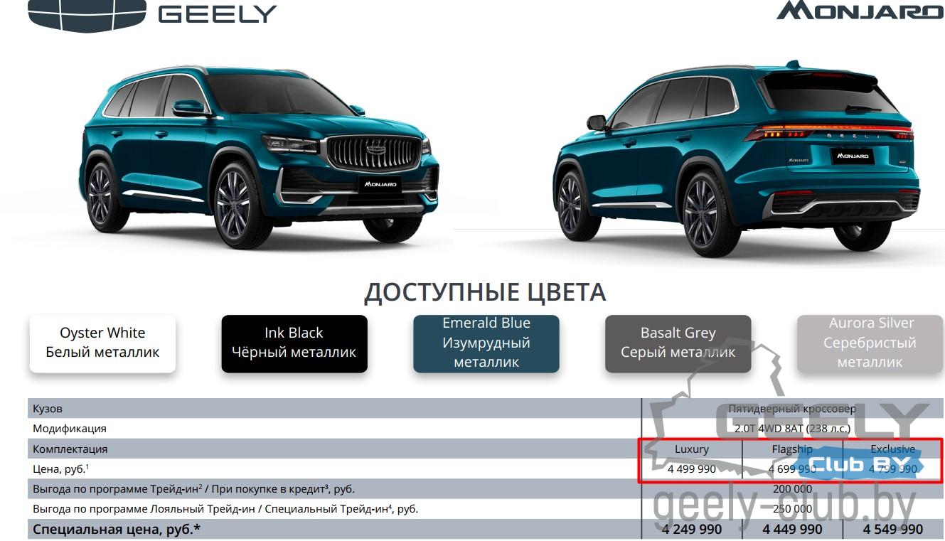 Согласно предоставленной информации на российский рынок Geely Monjaro KX11 проникнет в пяти цветовых решений кузова и в трех комплектациях. С опциями всех комплектаций можно ознакомиться ниже.